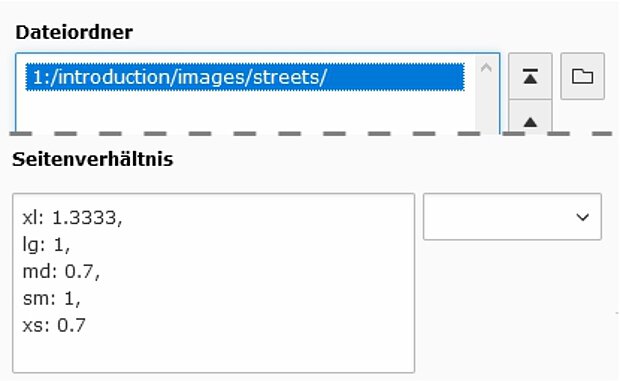 Um mehere Bilder mit dem selben Seitenverhältnis auszugeben, kann dieses über ein separates Feld definiert werden. Dies ist speziell bei der Ausgabe von Bildern eines Ordners nützlich, wenn die enthaltenen Bilder verschiedene Seitenverhältnisse aufweisen.