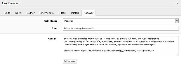 Popovers werden vom Bootstrap-Framework bereit gestellt. Sie erlauben die Anzeige von Zusatzinformationen in einem Fenster. Popovers können mit Hilfe des Link-Browsers über das Register Popover einfach definiert werden.